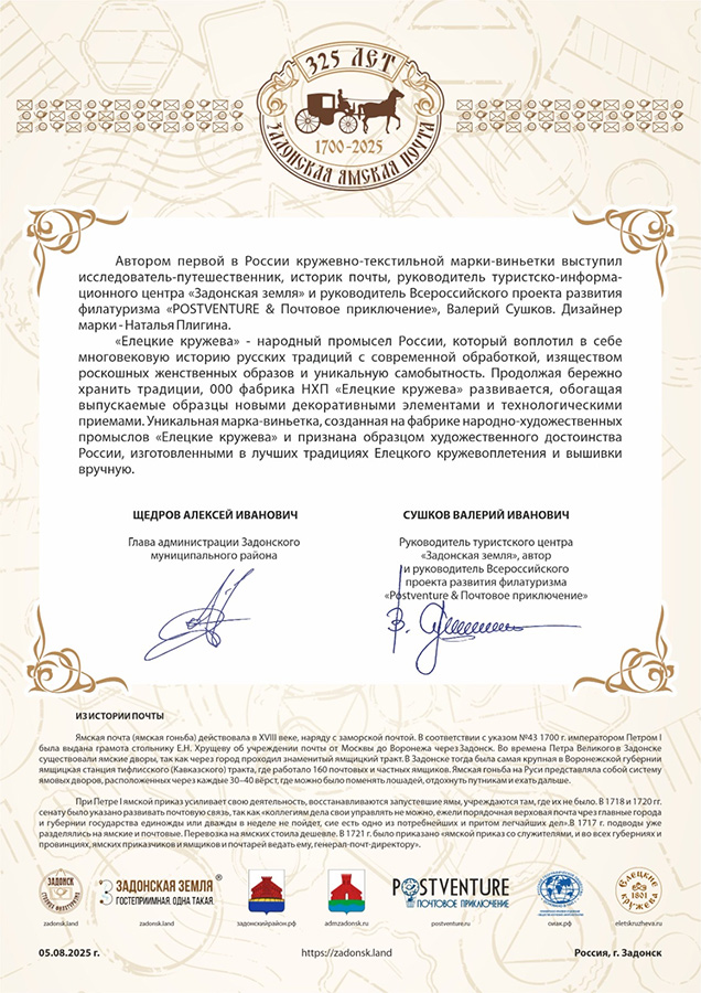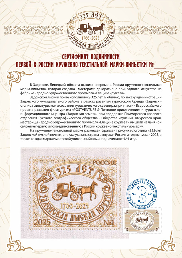 В Задонске, Липецкой области вышита впервые в России кружевно-текстильная марка-виньетка, созданная мастерами декоративно-прикладного искусства на фабрике народно-художественного промысла "Елецкие кружева". На кружевно - текстильной марке размещен фрагмент рисунка-логотипа "325-лет Задонской ямской почты", а также указана страна выпуска - Россия и год выпуска - 2025 , а также каждая марка имеет свой уникальный номинал, начиная от №1 и т.д. Автором первой в России кружевно-текстильной марки-виньетки выступил исследователь-путешественник, историк почты, руководитель туристско-информационного центра "Задонская земля" и руководитель Всероссийского проекта развития филатуризма "POSTVENTURE & Почтовое приключение", Валерий Сушков. Дизайнер марки - Наталья Плигина. | |